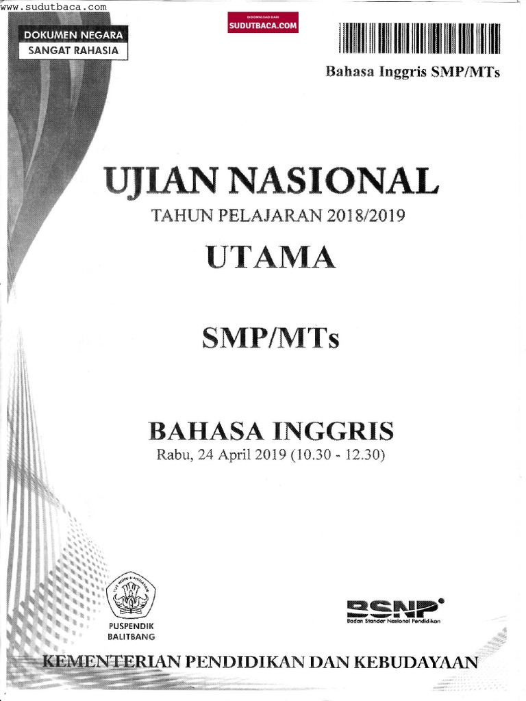 Soal UN SMPMTs 2019 Inggrispdf Unduh Demikian Naskah Soal Ujian Nasional UN UNBK Bahasa Inggris jenjang SMPMTs Tahun 2019 tahun pelajaran 20182019 yang dapat saya bagikan semoga bermanfaat. LATIHAN SOAL SOAL UN UNBK SMP TAHUN 2020 TAHUN PELAJARAN 20192020 Ujian Nasional UN merupakan evaluasi yang dilakukan oleh pemerintah yang juga harus memenuhi standar penilaian pendidikan yang berkaitan dengan mekanisme prosedur dan instrumen penilaian hasil belajar peserta didik sesuai dengan Permendikbud tentang Standar penilaian pendidikan. Soal Latihan Ujian Nasional Bahasa Inggris SMPMTs K13 dan KTSP yang coba saya bagikan ini hanya sekedar gambaran atau bentuk soal bukanlah soal.